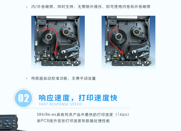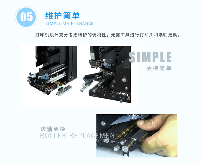 新機(jī)型采用了很多新設(shè)計(jì)方便操作人員去使用,系統(tǒng)方面沿用以確保持續(xù)運(yùn)行。打印頭更換非常簡(jiǎn)單緣于無需工具、更長(zhǎng)接線且便于檢修。滾軸更換簡(jiǎn)單快速緣于環(huán)扣設(shè)計(jì);傳感器蓋的不粘膠表面設(shè)計(jì)使工程師或操作人員無需工具就能輕松清潔或更換零部件。