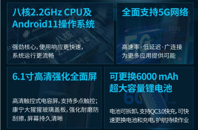 八核2.2GHzCPU及 全面支持5G網(wǎng)絡(luò) Android11操作系統(tǒng) 強勁核心,使用響應(yīng)更快速, 高速率·低延遲·廣連接 系統(tǒng)運行更流暢 為更多應(yīng)用提供可能 6.1寸高清強化全面屏 可更換6000 mAh 超大容量鋰電池 高清觸控式電容屏,支持多點觸控; 康寧大猩猩玻璃蓋板,強化耐磨防 電池可拆卸,支持QC3.0快充,可快 刮擦,屏幕持久清晰 速更換電池和充電。