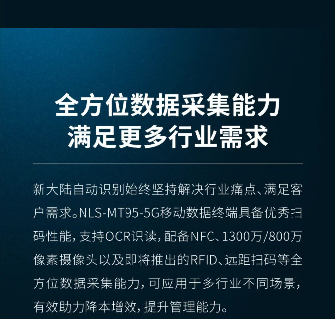 全方位數(shù)據(jù)采集能力滿足更多行業(yè)需求 新大陸自動識別始終堅持解決行業(yè)痛點、滿足客戶需求。NLS-MT95-5G移動數(shù)據(jù)終端具備優(yōu)秀掃碼性能,支持OCR識讀,配備NFC、1300萬/800萬像素攝像頭以及即將推出的RFID、遠(yuǎn)距掃碼等全方位數(shù)據(jù)采集能力,可應(yīng)用于多行業(yè)不同場景有效助力降本增效,提升管理能力。